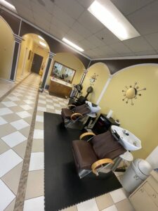 Turnkey Setup — includes 4 hairstyling stations, 2 hair washing sinks, 5 pedicure/manicure chairs, a double-sink vanity, 2 private spa rooms with new beds, large waiting area with floor-to-ceiling windows, and a stylish front desk